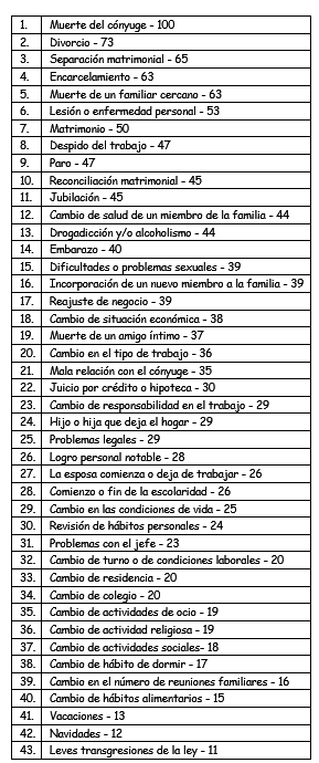 Esta es la escala, que empieza por los eventos más estresantes. ¿Qué te parece?: